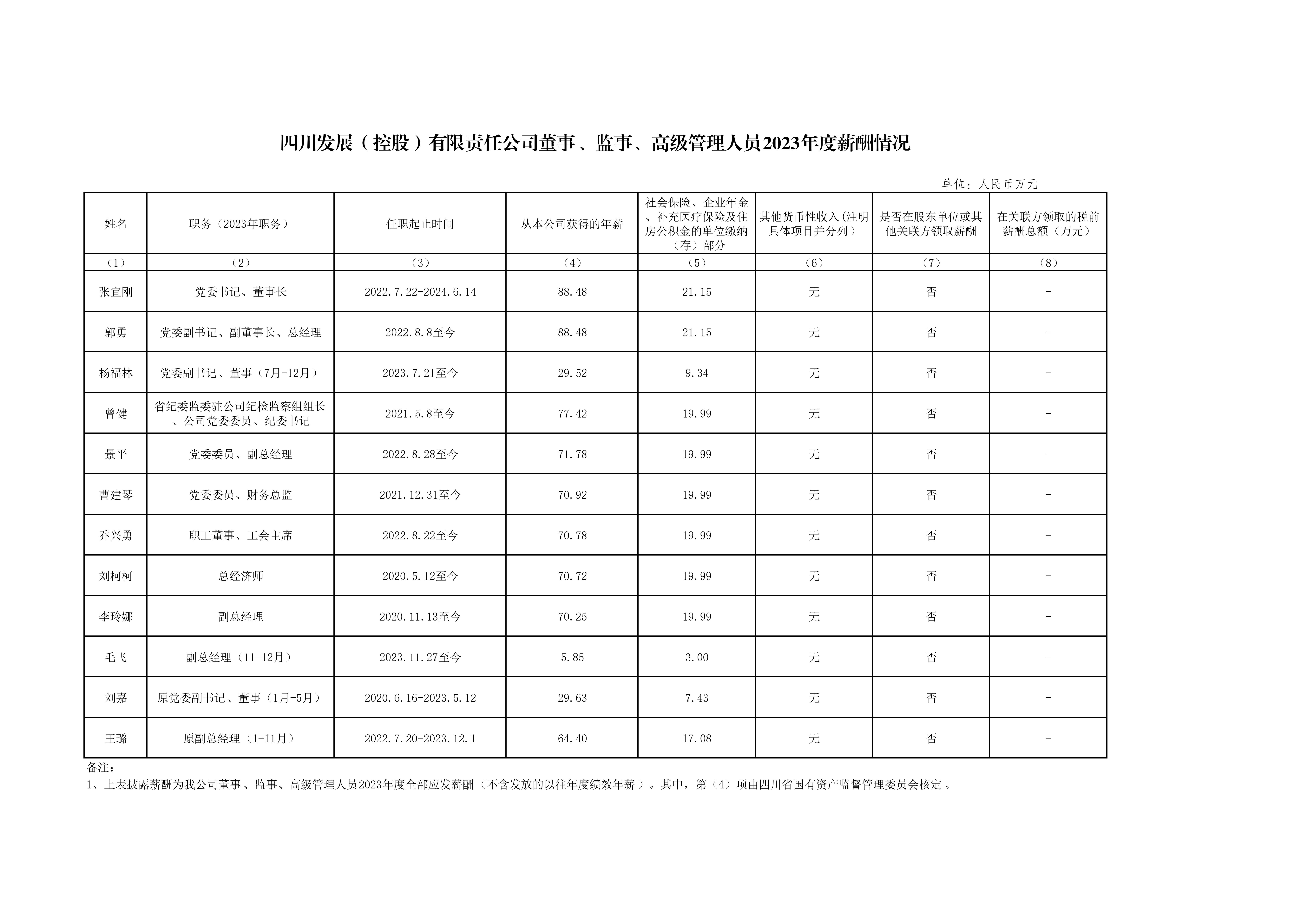 四川發展(控股)有限責任公司董事、監事、高級管理人員2023年度薪酬情況